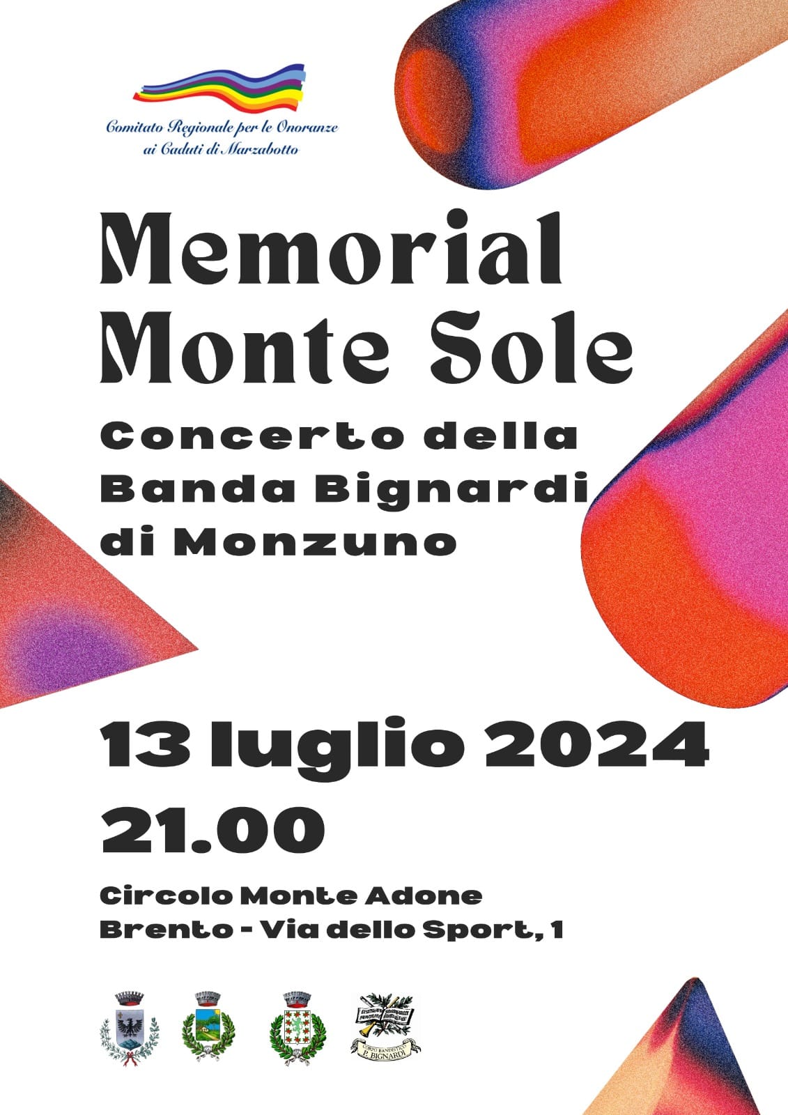13/07/2024 | Memorial Monte Sole Sabato 13 luglio alle 21,00 presso il Circolo Monte Adone a Brento avrà luogo il Memorial Monte Sole, con il Concerto della Banda Bignardi di Monzuno! Non mancate!