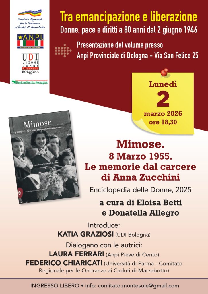 Continua il ciclo di presentazioni “Tra emancipazione e liberazione. Donne, pace e diritti a 80 anni dal 2 giugno 1946”. Lunedì 2 marzo 2026, alle ore 18,30, sempre presso la sede dell’ ANPI provinciale Bologna sarà presentato il volume “Mimose. 8 marzo 1955. Le lettere dal carcere di Anna Zucchini”, Enciclopedia delle donne 2025, curato da Eloisa Betti e Donatella Allegro. Sarà con noi anche Katia Graziosi dell’UDI Bologna.