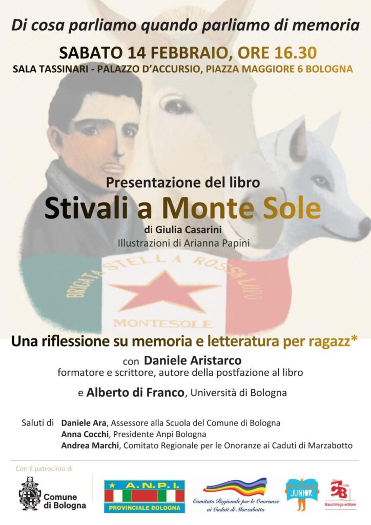 Sabato 14 febbraio alle 16,30 presso la Sala Tassinari di Palazzo d’Accursio a Bologna sarà presentata la nuova edizione di “Stivali a Monte Sole” di Giulia Casarini, con le illustrazioni di Arianna Papini e edito da Bacchilega Junior. A partire da questo volume saranno sviluppate riflessioni sulla memoria e sulla letteratura per ragazzi e ragazze. Insieme ad Andrea Marchi, del Comitato Regionale per le Onoranze ai Caduti di Marzabotto, saranno con noi Daniele Aristarco, Alberto di Franco, e porteranno i loro saluti Daniele Ara per il comune di Bologna e Anna Cocchi per l’Anpi Provinciale di Bologna.